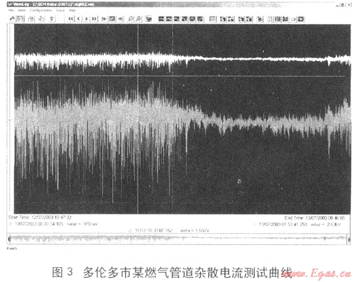 美國(guó)腐蝕工程師學(xué)會(huì)(NACE)在2004年發(fā)布了一篇報(bào)告《對(duì)影響管道的雜散電流的一種測(cè)試技術(shù)》,報(bào)告中提出可以采用SCM測(cè)試儀等方法對(duì)影響管道的雜散電流進(jìn)行測(cè)試,并以加拿大多倫多市的一條燃?xì)夤芫€(xiàn)的測(cè)試數(shù)據(jù)為例進(jìn)行分析,詳見(jiàn)圖3。測(cè)試數(shù)據(jù)顯示,燃?xì)夤艿朗艿诫s散電流干擾,報(bào)告中分析干擾信號(hào)與附近電氣化鐵路的運(yùn)行有關(guān),應(yīng)該是來(lái)源于鐵路的運(yùn)行。