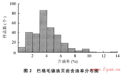 共分析含油率樣品459件,對356個含油率大于1.5%的樣品統(tǒng)計,含油率平均值為3.9%;對179個含油率大于3.5%的樣品統(tǒng)計,平均含油率為5.3%??梢哉J(rèn)為本區(qū)油頁巖含油率為3.9%~5.3%,為中-低含油率油頁巖。從本區(qū)含油率的概率分布圖(圖2)可以看出,峰值主要出現(xiàn)在4%~5%,說明該區(qū)絕大多數(shù)油頁巖含油率偏低,只有少數(shù)的高含油率層位或樣品出現(xiàn)。