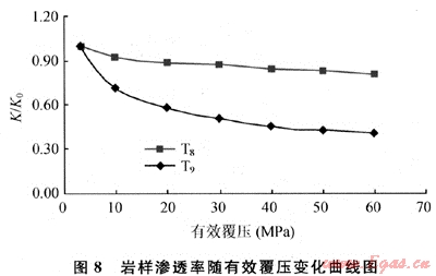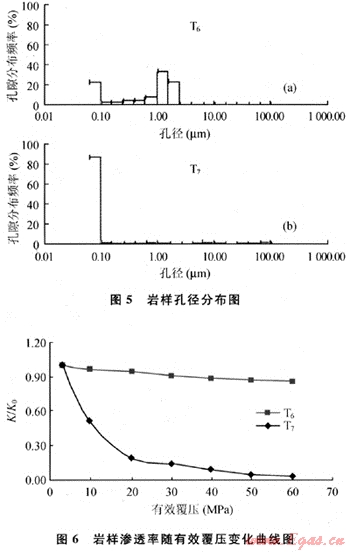 T6(K0’=12.62×10-3μm2,φ0=14.8%)和T7(K0’μm2,φ0=3.7%)是孔滲參數(shù)差=0.079×10-3異較大的兩塊巖樣。從巖樣的孔徑分布圖與覆壓滲透率變化曲線(圖5、6)可以看出:對于低孔低滲透巖樣,小孔徑占了絕大多數(shù),在覆壓實(shí)驗(yàn)中,小孔道一旦受到壓縮發(fā)生塑性變形就會嚴(yán)重喪失滲流功能,導(dǎo)致巖樣的滲透率大幅下降,表現(xiàn)出較強(qiáng)的應(yīng)力敏感性。