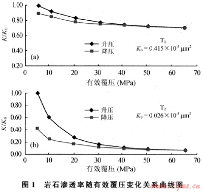 圖1是采用CMS300測得的低滲透巖石滲透率與有效覆壓關(guān)系曲線。從圖1可看出:①巖樣初始滲透率(K0’越低,滲透率在有效覆壓增加的過程中的下降幅度越大;②滲透率在有效覆壓增大的初始階段下降幅度最大,覆壓降低后滲透率不能完全恢復(fù),說明巖樣在實(shí)驗(yàn)過程中發(fā)生了微量的軟塑性變形。)