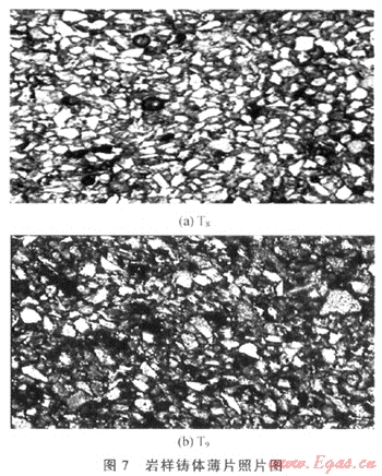 巖石受力過程中,最先發(fā)生變形的是泥質(zhì)和膠結(jié)物,這些物質(zhì)的含量越高,巖石發(fā)生軟塑性變形的程度越大,則巖石在覆壓實(shí)驗(yàn)中滲透率的下降幅度越大。對T8和T9兩塊巖樣進(jìn)行鑄體薄片觀察(圖7),得知T9的填隙物含量和泥質(zhì)含量均高于T8(物性參數(shù)見表1),從圖8可知T9的應(yīng)力敏感性強(qiáng)于T8。對于不同的油氣藏,因成藏過程不同,其巖石成分有較大差異,因而應(yīng)力敏感性也會存在差異。