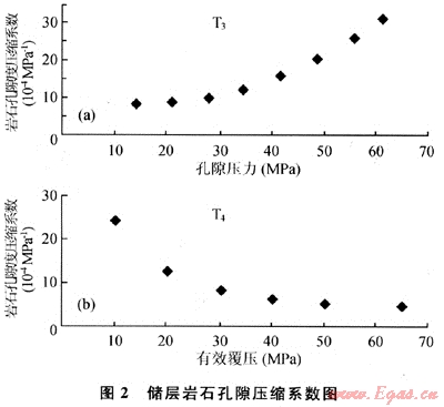 圖2是采用增加圍壓與降低孔隙壓力兩種方法所測得的巖石孔隙壓縮系數(shù)與應(yīng)力的關(guān)系曲線。從圖2中可以看出是變化值而非固定值,初始值很高,隨著圍壓增大、孔隙壓力減小,下降很快,圍壓、孔隙壓力達(dá)到一定值后,變化不大,保持穩(wěn)定,這表明在實(shí)驗(yàn)過程中巖石發(fā)生的并非理想的線彈性變形。