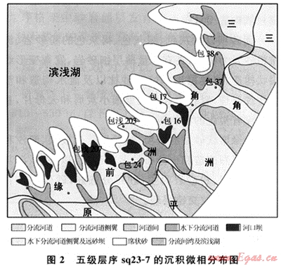 確定重點(diǎn)五級(jí)層序,進(jìn)行儲(chǔ)層精細(xì)刻畫,對(duì)sq13-6、sq21-4、sq21-6、sq23-3、sq23-7、sq31-4、sq31-7、sq33-2、sq33-7等9個(gè)重點(diǎn)含氣的五級(jí)層序進(jìn)行了儲(chǔ)層的精細(xì)刻畫。以五級(jí)層序sq23-7為例(圖2),其沉積沉積物源主要來自工區(qū)南部及東南部方向,區(qū)內(nèi)發(fā)育三角洲平原水上分流河道、河道間洼地,三角洲前緣水下分流河道、河口壩、遠(yuǎn)砂壩及席狀砂等沉積微相,并可精細(xì)刻畫出河道主體與河道側(cè)翼。河包場(chǎng)氣田主要處于水下分流河道、河口壩砂體主體發(fā)育帶。分流河道砂巖厚度在10m以上;河口壩砂巖厚度為8~10m,其發(fā)育位置包括包淺207-包淺205井區(qū)、包淺201井區(qū)、包4井區(qū)、包46井區(qū)等。遠(yuǎn)砂壩的砂巖厚度一般為2~4m,分布在河口壩前端,由于受湖水的改造而形成的席狀砂呈帶狀分布,二者呈過渡關(guān)系,不易區(qū)分。