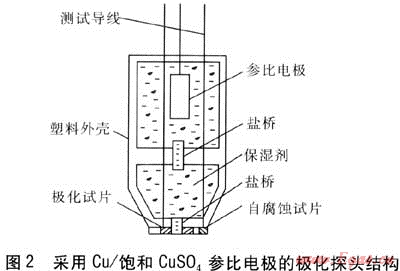 下面以Cu/飽和CuSO4參比電極探頭結(jié)構(gòu)為例進(jìn)行說(shuō)明,探頭結(jié)構(gòu)見(jiàn)圖2。該極化探頭分為上、下兩個(gè)腔室,上腔室為參比電極安裝室,下腔室安裝有極化試片、自腐蝕試片、保濕劑,上腔室與下腔室、下腔室與極化試片通過(guò)導(dǎo)電鹽橋連接[3]。極化探頭有3根導(dǎo)線分別與參比電極、極化試片、自腐蝕試片相連接。極化試片的連接導(dǎo)線既用作試片的極化線又兼作電位的測(cè)量線。