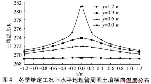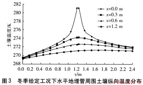 由圖4可知,土壤溫度沿橫軸方向成完全對(duì)稱的單峰狀分布,經(jīng)分析可得到如下結(jié)論:①?gòu)牡芈窆芩谖恢脁=0沿橫向向兩側(cè)遠(yuǎn)離地埋管,土壤溫度逐漸降低。在y=0.6、0.9、1.2m的3條橫軸上,溫度曲線存在以戈=0為中心向兩側(cè)下降的趨勢(shì),即土壤溫度在x=0處溫度最高,向兩側(cè)降低。同樣在y=1.2m這條橫軸上,溫度分布不連續(xù),在管外壁最左端x=-0.0145m與最右端x=0.0145m之間間斷,這是水平地埋管位置所在。②4條曲線的變化幅度不同,y=1.2m橫軸上的土壤溫度變化最大,y=0橫軸上的溫度變化最小。這說(shuō)明隨著位置
