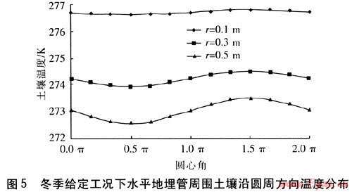 由圖5可知:①土壤溫度沿圓周方向呈正弦曲線分布,每個(gè)圓周上溫度最高點(diǎn)(曲線波峰)都是出現(xiàn)在原平面的1.5π方向,即圓周最底端;溫度最低點(diǎn)(曲線波谷)出現(xiàn)在原平面的0.5π方向,即圓周最頂端。②圓周方向上的土壤溫度呈正弦曲線分布,但每個(gè)圓周上的土壤平均溫度不同,即土壤溫度沿3條正弦曲線都在自己的中心線附近變化。這是由于隨著圓周遠(yuǎn)離地埋管,土壤溫度逐漸降低,r=0.1m圓周上的土壤平均溫度要高于r=0.3、0.5m圓周上的土壤平均溫度。③圓周方向上的土壤溫度呈正弦曲線分布,但每個(gè)圓周上的土壤溫度變化幅度各不相同,即溫度曲線的振幅不同。r=0.1m的曲線振幅最小,r=0.5m的曲線振幅最大,即距地埋管中心越近的圓周,其上土壤溫度變化程度越?。痪嗟芈窆苤行脑竭h(yuǎn)的圓周,其上土壤溫度變化程度越大。這是由于地埋管上方的土壤隨著位置越遠(yuǎn)離地埋管越易受到大氣低溫的影響,因此地埋管上方的土壤隨著位置遠(yuǎn)離地埋管,溫度逐漸降低,而且這種降低的速度越來(lái)越快。而地埋管下方的土壤隨著位置越遠(yuǎn)離地埋管受大氣低溫的影響越小,這部分土壤由于遠(yuǎn)離地埋管溫度也逐漸降低。但由于深度加大受大氣低溫影響減小,這種降低的速度卻是越來(lái)越慢的。這就導(dǎo)致在距地埋管距離越遠(yuǎn)的圓周上,土壤溫度差距越大,即同一圓周上土壤的溫度變化越劇烈,變化的范圍越大。
