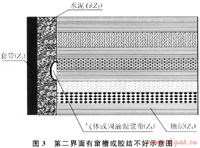 如圖3所示,當(dāng)?shù)诙缑婺z結(jié)質(zhì)量較差時(shí),與前面對第一界面膠結(jié)不好的分析類似,水泥環(huán)與地層之間存在第三介質(zhì),第三介質(zhì)一般反映為氣體、液體或固液混漿。