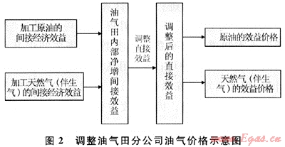 根據(jù)前面的分析可知,要真實地考察油氣田開發(fā)建設項目給企業(yè)帶來的經(jīng)濟效益,就必須考慮其產(chǎn)生的內(nèi)部凈增間接效益。在油氣田開發(fā)建設項目財務評價時,為了真實反映內(nèi)部凈增間接效益給油氣田分公司各財務指標帶來的變化,應該調(diào)整油氣田分公司的油氣價格,以及整個分公司的稅后利潤。為分析問題方便起見,把考慮油氣田內(nèi)部凈增間接效益后的價格稱之為效益價格,調(diào)整思路如圖2所示。