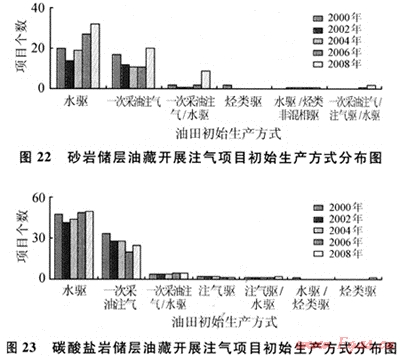 我國大部分油田仍以傳統(tǒng)的注水方式進行開發(fā),這些油藏能否注氣一直是關(guān)心的問題。從圖22、23中可以看出:近10a來,世界范圍內(nèi)無論是砂巖還是碳酸鹽巖油藏注氣項目,采用先注水后注氣的項目比進行一次注氣的項目多,因此,無論是新油田的開發(fā)還是老油田二次開發(fā),注氣均被認為是一項行之有效的提高采收率技術(shù)。