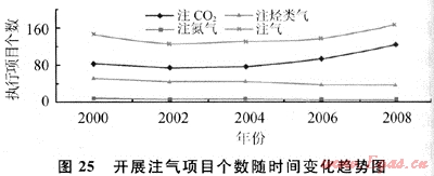 目前,我國CO2排放量居世界第二位,并且還在增長[13]。預(yù)測表明,到2025年,我國CO2排放總量很可能超過美國,居世界第一位。由圖25可以看出:近10a來,世界注氣特別是注CO。提高采收率技術(shù)(EOR)項目逐年增加,已成為世界范圍內(nèi)提高原油產(chǎn)量的重要手段之一。CO2在幾種氣體中混相壓力最低,效果最好,氣源最豐富,發(fā)展注CO2驅(qū)油將是我國的方向。