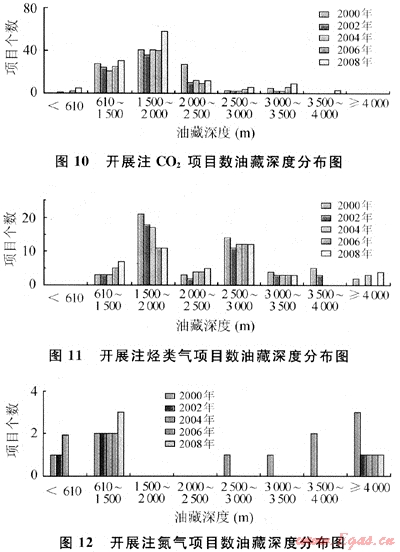 從理論上分析,CO2驅(qū)需要的混相壓力最低,所以實現(xiàn)混相的深度最淺,采用CO2驅(qū)的油藏深度主要分布在610~2000m(圖10),而且主要是混相驅(qū);烴類氣驅(qū)混相壓力相對較高,油藏深度主要是1500~2000m及2500~3000m(圖11);氮氣驅(qū)所要求的混相壓力最高,但許多油藏都應(yīng)用了重力驅(qū),因此不需混相,目前實施的項目油藏深度在610~1500m范圍(圖12)。