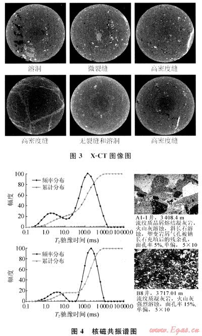 火山巖儲層孔洞發(fā)育較差,部分巖心內(nèi)可見有裂縫,但裂縫有兩種明顯不同的產(chǎn)狀特征:①裂縫的寬度雖然較大,但裂縫內(nèi)通常被高密度的物質(zhì)充填;②裂縫的寬度雖然較小,但裂縫通常處于張開狀態(tài),裂縫內(nèi)的充填物較疏松,孔、洞、縫之間的連通性較差(圖3)。