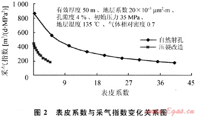 從模擬看(圖2),壓裂井表皮系數(shù)在0.3時,采氣指數(shù)與零表皮對比下降幅度在10%左右,由于壓裂井表皮系數(shù)普遍較低,因此表皮系數(shù)對壓裂井產能影響較小。射孔完井的井表皮系數(shù)一般較高,因此表皮系數(shù)對產能的影響較大,如果表皮系數(shù)達到20,則采氣指數(shù)與表皮系數(shù)為0時的對比下降幅度達到68%。有些射孔完井的井在試采中產量與壓力保持穩(wěn)定,關井后壓力恢復程度高,恢復速度快,但采氣指數(shù)并不高,與表皮系數(shù)的影響有很大關系。