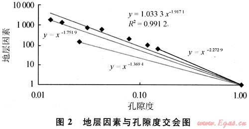 根據(jù)地層因素與孔隙度交會圖(圖2),研究區(qū)a平均取值為1.033,仇平均取值為1.92。