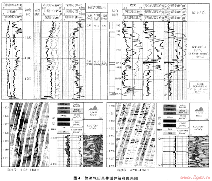 利用上述方法編制常規(guī)測井資料識別裂縫發(fā)育程度評價程序和裂縫參數(shù)計算程序,并對研究區(qū)若干井進行了計算,圖4是其中一口井的處理解釋結(jié)果:195Ⅰ層TCP+MFE-Ⅰ測試,日產(chǎn)氣105876m3,該層地層因數(shù)比值為15.6,裂縫角度指示參數(shù)為1.9,顯示該層高角度裂縫較發(fā)育,裂縫張開度1150.5μm,裂縫孔隙度0.11%,裂縫滲透率310.9×10-3μm2,F(xiàn)MI圖像顯示195Ⅰ層垂直縫和高角度縫發(fā)育,核磁測井T2分布譜顯示為30ms以上的大孔隙,表明本層裂縫提供了極好的流體滲流通道,使得儲層在自然測試時能達到高產(chǎn)。下部195Ⅴ、195Ⅵ兩層地層因數(shù)比值29.9,裂縫角度指示參數(shù)0.5,顯示該段地層發(fā)育40°~70°的傾斜裂縫,測井計算的裂縫張開度為9.8μm,裂縫孔隙度0.02%,裂縫滲透率0.002×10-3μm2,表明該段地層裂縫雖然發(fā)育,但為無效縫或裂縫的徑向延伸較淺,沒有起到溝通流體滲流通道的作用,對產(chǎn)能沒有貢獻。FMI圖像顯示195Ⅴ、195Ⅵ兩層存在誘導縫特征,徑向延伸短,裂縫開度小,是無效縫。核磁測井T2分布譜顯示小于30ms的束縛水孔隙,地層裂縫被低阻泥質(zhì)充填。該段地層經(jīng)TCP+MFE-Ⅰ測試,日產(chǎn)氣106m3。