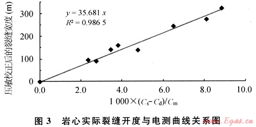 巖心實際裂縫開度(經(jīng)壓敏校正)與電測值關系(圖3)表明:A=3.5×104,比理論值高,說明工區(qū)低角度縫很少。當出現(xiàn)低角度縫且Cs<Cd時,公式中的(Cs-Cd)換成(Cd-Cb),其中,Cb為基巖塊電導率,從與解釋層鄰近的非裂縫性地層讀取,裂縫愈發(fā)育,側(cè)向測井比基質(zhì)電阻率降得愈低。