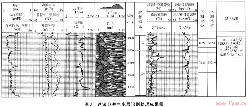 圖3是達(dá)深B井流體識(shí)別處理成果圖,巖性為玄武巖。從圖中可以看到,試氣層段應(yīng)用核磁共振判別法的密度孔隙度與核磁計(jì)算孔隙度有明顯幅度差,應(yīng)用雙密度重疊法也見(jiàn)明顯含氣反映,且錄井氣測(cè)比值較大,綜合分析判別該層為氣層。實(shí)際試氣結(jié)果表明,3888.0~3907.0m井段壓后日產(chǎn)氣18851m3,與測(cè)井識(shí)別結(jié)果一致。