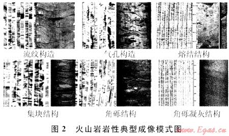 徐深氣田火山巖巖性成因復雜,即使巖石化學成分相同,但如果結(jié)構(gòu)、構(gòu)造不同,其巖石類型也會不同。而應用交會圖版法雖然可以識別成分不同的巖性(如酸性巖、中性巖和基性巖等),但對于成分相同、而結(jié)構(gòu)或構(gòu)造不同的巖性如流紋質(zhì)熔結(jié)凝灰?guī)r、角礫凝灰?guī)r、火山集塊巖、火山角礫巖這些火山巖巖性識別效果較差,對這類巖性必須結(jié)合成像測井進行識別。圖2為火山巖典型成像模式圖。