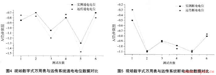 南圖4和圖5所示,南無線采集系統(tǒng)和數(shù)字萬(wàn)用表測(cè)得的通/斷電電位數(shù)據(jù)是很接近的,通電電位數(shù)據(jù)誤差在15%之內(nèi),這可能是由于此處管道受干擾較大,電位變動(dòng)很快,人工記錄的時(shí)間無法完全精確同步,所以,存在一定的人為引入誤差,不完全是儀器的誤差。而斷電電位誤差基本在5%之內(nèi)。這說明所采用的無線遠(yuǎn)傳系統(tǒng)測(cè)量結(jié)果是準(zhǔn)確的,相對(duì)于數(shù)字式萬(wàn)用表測(cè)量,采用無線采集傳輸系統(tǒng)在測(cè)量通/斷電電位時(shí)可避免人為讀數(shù)造成的誤差,在長(zhǎng)時(shí)間連續(xù)監(jiān)測(cè)數(shù)據(jù)時(shí)能夠大大減少工作人員的勞動(dòng)強(qiáng)度,提高效率,因此,對(duì)于雜散電流干擾區(qū)的測(cè)量,無線采集傳輸系統(tǒng)具有明顯優(yōu)勢(shì)。