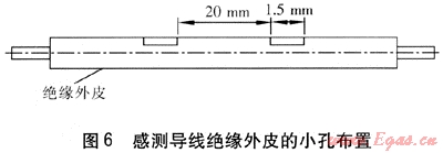 感測導線的絕緣外皮有規(guī)則的孔(見圖6),小孔可以感知保溫層濕度的變化。孔的間隔為20mm,每個小孔的寬度為1.5mm。漏點檢測系統(tǒng)要求感測導線、反饋導線與管道之間的阻抗以及兩導線之間的絕緣電阻必須大于等于50MΩ。
