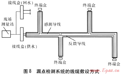漏點檢測系統(tǒng)線纜敷設必須遵循以下原則:只有感測導線敷設至分支管,反饋導線不敷設到分支管。漏點檢測系統(tǒng)的線纜敷設方式見圖8,圖8僅為供水管道的線纜敷設方式,回水管道需另外敷設線纜。