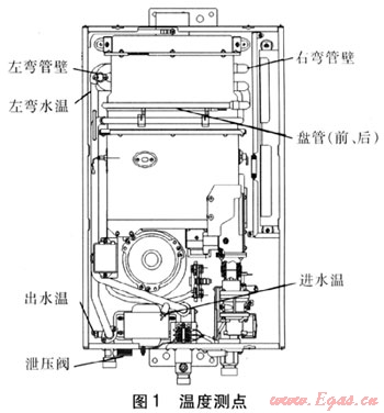 圖1為溫度測點(diǎn),此外,還有室外溫度和熱水器周圍溫度(廚房、冷陽臺),其中左彎水溫、進(jìn)水溫、出水溫采用在水管上鉆孔將溫度探頭伸進(jìn)管中測水溫形式,其余各點(diǎn)則測水管外壁。