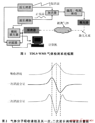 技術(shù),其系統(tǒng)框圖見圖1。圖1中采用加法器將高頻正弦調(diào)制信號同低頻調(diào)諧信號結(jié)合起來,作為激光器的驅(qū)動(dòng)電流,在光電探測器將氣體吸收之后的光信號轉(zhuǎn)變?yōu)殡娦盘栞敵霾⒂面i相放大器進(jìn)行相敏檢波,從而獲得被測氣體吸收譜線的諧波分量。圖2為氣體分子吸收譜線及其一次、二次波長調(diào)制諧波分量的示意圖。
