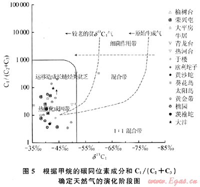總體看,該區(qū)大部分天然氣含量有較大差異,說明該區(qū)存在明顯的運移作用過程。 依據(jù)天然氣甲烷碳同位素值及干燥系數(shù)對天然氣的成熟度進行估算,該區(qū)絕大多數(shù)樣品處于成熟階段,主要屬于熱解氣。但在黃沙坨及葵花島地區(qū),其天然氣的成熟度相對比較高,已經(jīng)達到了裂解氣的階段。因而可依據(jù)天然氣的甲烷同位素值對各個地區(qū)天然氣的演化階段進行劃分,主要屬于熱解氣。
