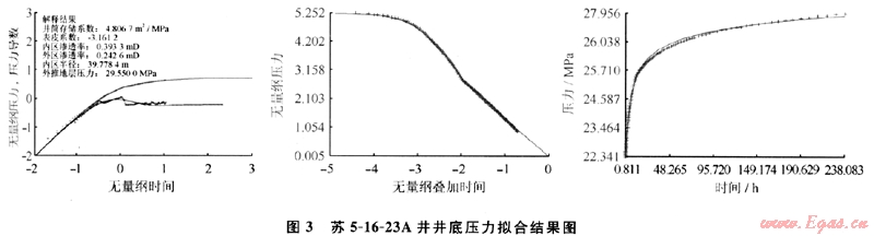 最終得到了該井表皮系數(shù)為-3.16,說明是壓裂后受效井,表皮系數(shù)較?。环治鲈摼貙幽P蜑閺?fù)合地層,內(nèi)區(qū)滲透率為0.39mD,內(nèi)區(qū)半徑為39.7m,說明近井地帶40m左右是壓裂后滲透性改善區(qū);而外區(qū)滲透率0.2426mD,說明壓裂縫外圍地層的滲透情況。