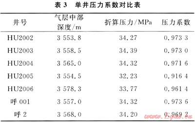 根據(jù)單井初期不穩(wěn)定試井資料,將氣井初期地層壓力折算至統(tǒng)一海拔深度,扣除投產(chǎn)時間晚2a的HU2005井和HU2006井,其余井壓力系數(shù)在0.9716~0.9736之間(表3),相對偏差較小,在0.05%~0.1%,說明未投產(chǎn)前各井同屬一個壓力系統(tǒng)。