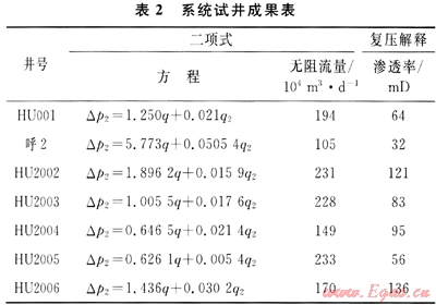 應(yīng)用壓力恢復(fù)、壓降、系統(tǒng)試井和一點法等多種試井方法研究儲層物性及產(chǎn)能特點。確定了各氣井較為真實可靠的產(chǎn)能方程(表2),為新井配產(chǎn)提供了依據(jù);同時,運用三維建模和數(shù)值模擬技術(shù),確定了合理井距為1400m,為實現(xiàn)稀井高產(chǎn)創(chuàng)造了條件。