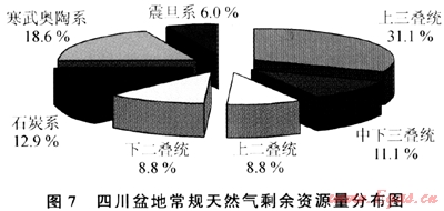 四川盆地天然氣資源豐富,盆地天然氣資源量為10.6×1012m3,按盆地現(xiàn)有探明儲量計算,探明率僅19.5%。隨著新技術推廣應用和認識深化,盆地二疊系長興組、三疊系飛仙關組礁灘以及三疊系須家河組勘探相繼獲得重大突破,資源量還將有較大增長,資源潛力很大。從待發(fā)現(xiàn)資源分布來看,以上三疊統(tǒng)為最多,占31.1%;其次為中下三疊統(tǒng)-上二疊統(tǒng),占19.9%(圖7)。此外,四川南部地區(qū)下古生界海相頁巖氣資源豐富,初步估算寒武系筇竹寺組和志留系龍馬溪組頁巖氣資源量在4×1012m3以上。這些領域都是四川盆地下一步勘探開發(fā)的重點,也是盆地天然氣持續(xù)上產的重要方向。