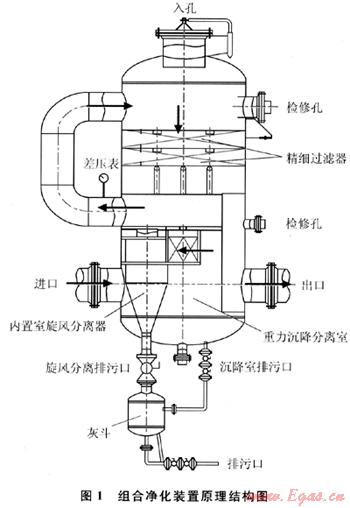 從油田伴生氣加工裝置實際運行狀況和設(shè)備內(nèi)沉積污垢(油泥)的情況分析來看,油田伴生氣中的液體(油、水)含量較高,而天然氣加工工藝條件要求系統(tǒng)阻力小,對于氣負荷較大、壓力較低、雜質(zhì)顆粒小的油田伴生氣加工,普通及單一的分離技術(shù)難以達到工藝生產(chǎn)要求,需要研制出一種結(jié)合了重力沉降、離心分離及過濾多級分離技術(shù)的組合凈化裝置。