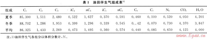 2) 油田伴生氣組成:油田伴生氣組成見表1。