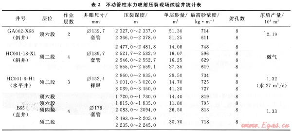 在前期大量有效研究的基礎(chǔ)上,共完成了4口井的現(xiàn)場試驗。試驗結(jié)果表明:目前已經(jīng)形成了井深3000m以內(nèi)的不動管柱水力噴射壓裂工藝及配套技術(shù);研制的井下工具工作壓力達到60MPa、工作溫度達到90℃,在Φ178、Φ139.7mm兩種套管和Φ215.9、Φ152.4mm兩種裸眼使用。試驗井實現(xiàn)不動管柱壓裂3~4條縫,單縫壓裂成功率100%。返排后,投產(chǎn)順利,其中HC001-6-H1井實現(xiàn)了3段合采,865井實現(xiàn)了3層(4段)合采(表2)。