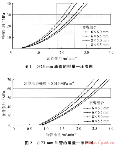 油管作為攜砂的通道,排量選擇主要受噴嘴直徑和個數(shù)的影響,選擇8×5.5mm噴嘴組合可滿足要求。因此,油管排量設(shè)計應(yīng)該在保證井口不超壓的前提下,盡可能提高泵注排量。