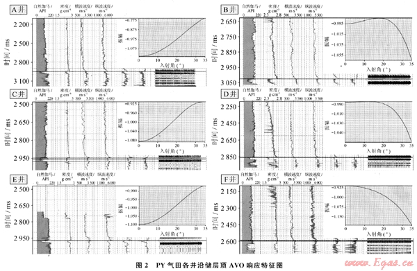 從圖2中可見:PY地區(qū)構(gòu)造圈閉內(nèi)的井(A井、C井、E井)氣層頂表現(xiàn)為振幅隨偏移距增大而減小的趨勢;復(fù)合圈閉內(nèi)的含氣砂巖(D井、F井)則表現(xiàn)為振幅隨偏移距增加而增大的特征,不同圈閉類型的儲層AV0響應(yīng)特征不同的根本原因在于坡折帶上沉積環(huán)境不同,導致泊松比關(guān)系不同,從而影響到AV0響應(yīng)特征;含水砂巖(B井)則表現(xiàn)為振幅隨偏移距增加而增大的含氣的特征。因此,在研究區(qū)用AV0技術(shù)預(yù)測儲層的含油氣性具有很大的不確定性。