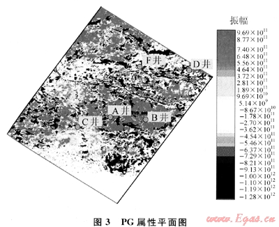 沿SB21.0儲層頂?shù)玫紸V0的PG屬性平面圖(圖3),紅色區(qū)域代表儲層頂?shù)暮瑲馓卣鳛?ldquo;第三類”的AV0異常。按以往對儲層含油氣性的認識,PY地區(qū)有利的勘探目標(“第三類”AV0異常)主要集中在紅色區(qū)域。AV0技術(shù)預(yù)測結(jié)果在B井處就不符合實鉆的結(jié)論。