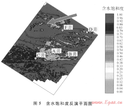多屬性反演技術(shù)即是利用測井曲線和地震數(shù)據(jù)的關(guān)系“預(yù)測”或估測地震體上所有點的測井曲線特征體。利用基于神經(jīng)網(wǎng)絡(luò)的多屬性反演技術(shù)得到了研究區(qū)的含水飽和度圖5。綜合分析圖4、5,認為圖4所示的F井北部應(yīng)是一個相對高含水的區(qū)域,其余各井儲層含油氣性的預(yù)測結(jié)果與實鉆結(jié)果較符合(圖5)。