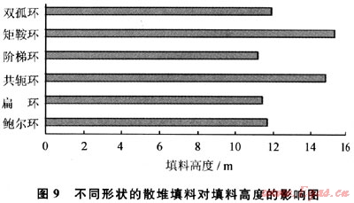 由于海上油田伴生氣中C02含量隨著石油產(chǎn)量的降低會(huì)相應(yīng)增加,為了提高裝置的適應(yīng)性,因此在設(shè)計(jì)時(shí)必須預(yù)留一定的富裕度。表1中顯示的C02體積分?jǐn)?shù)為5.54%,是中海石油集團(tuán)對(duì)海上油田伴生氣組分多年統(tǒng)計(jì)得到的最高值,以此作為設(shè)計(jì)標(biāo)準(zhǔn),能夠保證凈化系統(tǒng)具有很強(qiáng)的適應(yīng)性。由于MDEA胺液吸收C02是一個(gè)氣液界面?zhèn)髻|(zhì)并伴有化學(xué)反應(yīng)的過程,提高傳質(zhì)效率能夠有效降低填料高度。采用高效的填料是一種有效的提高傳質(zhì)效率、降低塔器設(shè)備高度的有效方法。圖9給出了不同形狀的金屬散堆填料對(duì)填料高度的影響。從圖9可知,矩鞍環(huán)對(duì)應(yīng)的填料高度最大,而階梯環(huán)對(duì)應(yīng)的填料高度最小,這是因?yàn)殡A梯環(huán)的比表面積最大,而矩鞍環(huán)的比表面積最小,如矩鞍環(huán)的比表面積為112m2/m3,而階梯環(huán)的比表面積為153m2/m3。因此,本項(xiàng)目中吸收塔、再生塔皆采用階梯環(huán)的散堆填料塔。
