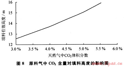 海上自升式移動(dòng)平臺(tái)一般由底艙、主甲板層、二層甲板層組成,其空間布局限制了海上橇裝油田伴生氣液化裝置的設(shè)計(jì)。油田伴生氣凈化系統(tǒng)中的吸收塔、再生塔作為液化裝置中最高的設(shè)備,其高度受到嚴(yán)格限制,一般要求不超過20m。因此,優(yōu)化吸收塔、再生塔高度,不僅能夠降低設(shè)備的投資,而且能夠降低海上移動(dòng)平臺(tái)設(shè)備的擺動(dòng),提高裝置運(yùn)行的穩(wěn)定性。圖8給出了在一定的胺液循環(huán)量條件下,進(jìn)吸收塔的原料氣中C02體積分?jǐn)?shù)對(duì)填料塔高度的影響。當(dāng)胺液循環(huán)量不變時(shí),減少進(jìn)入吸收塔的原料氣中C02含量,能夠有效降低填料塔高度。這是因?yàn)榘芬貉h(huán)量不變,C02含量降低時(shí),塔內(nèi)的醇胺溶液中C02含量降低,表面分壓降低,則較低的填料高度就能達(dá)到很高的凈化效果,因此能夠降低填料塔高度。同時(shí),一般情況下,富液的酸性負(fù)荷降低時(shí),胺液循環(huán)量也會(huì)適當(dāng)降低,從而降低再生塔能耗。