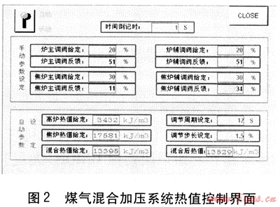 在這個(gè)控制系統(tǒng)中,高爐煤氣的熱值、焦?fàn)t煤氣的熱值、混合煤氣的給定熱值、閥門(mén)調(diào)節(jié)的周期、閥門(mén)調(diào)節(jié)的步長(zhǎng)都可以在操作界面上直接輸入,見(jiàn)圖2。此控制系統(tǒng)使用起來(lái)非常方便,調(diào)節(jié)后的熱值也可以即時(shí)顯示。通過(guò)WCC系統(tǒng)軟件,可以調(diào)出任何時(shí)刻的煤氣混合情況。