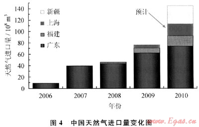 進(jìn)口液化天然氣(LNG)正在幫助緩解因需求迅速上升給國(guó)內(nèi)市場(chǎng)供應(yīng)帶來(lái)的壓力。自2006年5月26日國(guó)內(nèi)第一船進(jìn)口6×104t澳大利亞液化天然氣運(yùn)抵深圳大鵬灣以來(lái),國(guó)內(nèi)進(jìn)口液化天然氣設(shè)施已發(fā)展到3座,分布在廣東深圳、福建莆田和上海洋山,規(guī)模分別為370×104t/a、260×104t/a和300×104t/a。2009年液化天然氣進(jìn)口量已由2006年的69×104t猛增到553×104t(76×108m3)(圖4)。進(jìn)口液化天然氣以用作發(fā)電和工業(yè)燃料為主,也有一部分進(jìn)入城市天然氣管道,滿足民用燃?xì)庑枨?。隨著上海洋山進(jìn)口設(shè)施轉(zhuǎn)入正常運(yùn)轉(zhuǎn),并保障上海世博會(huì)期間的燃?xì)夤?yīng),中海油3座進(jìn)口設(shè)施2010年的進(jìn)口量可能會(huì)輕易超過800×104t。今后兩三年內(nèi),當(dāng)中石油江蘇如東和遼寧大連以及中海油浙江寧波共3座在建進(jìn)口設(shè)施建成投產(chǎn)時(shí),液化天然氣年進(jìn)口規(guī)模將由現(xiàn)在的930×104t擴(kuò)大到1880×104t。中海油預(yù)計(jì)到2020年僅該公司就將擁有5000×104t/a進(jìn)口液化天然氣接收能力。