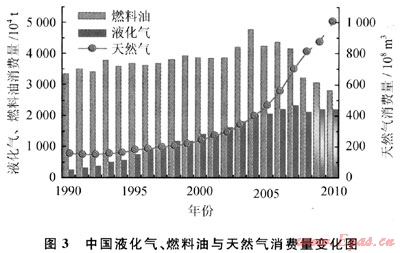 天然氣市場(chǎng)現(xiàn)正處于高速增長(zhǎng)的時(shí)期。在西氣東輸項(xiàng)目完工并于2004年10月開始向華東地區(qū)供氣后的5年里,國(guó)內(nèi)天然氣消費(fèi)量年均增幅達(dá)17%,2009年消費(fèi)量已增加到874×108m3[6]。而在這之前,20世紀(jì)90年代10年里的年均增幅只有4.5%。2010年,國(guó)內(nèi)天然氣消費(fèi)量估計(jì)將達(dá)到1050×108m3,到2020年預(yù)計(jì)將增長(zhǎng)兩倍達(dá)到3000×108m3,受沖擊最大的是燃料油和液化氣,液化氣需求增長(zhǎng)將受到嚴(yán)重阻礙(圖3)。