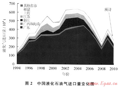 珠江三角洲和長(zhǎng)江三角洲是進(jìn)口液化氣的消費(fèi)中心(圖2)。廣東省是國(guó)內(nèi)最大的進(jìn)口液化氣市場(chǎng)。在過去5年里,廣東省進(jìn)口量一直占全國(guó)的70%左右。不過,價(jià)格高漲和經(jīng)濟(jì)滑坡引起的需求下降導(dǎo)致廣東省進(jìn)口量從最高時(shí)2005年的447×104t降低到2009年的178×104t。在這幾年里,國(guó)內(nèi)第一座年進(jìn)口370×104t液化天然氣(LNG)設(shè)施2006年5月在深圳建成投產(chǎn)以及比鄰的海南省800×104t/a新建煉油廠同年6月投產(chǎn)也給廣東省進(jìn)口液化氣市場(chǎng)帶來(lái)沖擊。不過,外向型的經(jīng)濟(jì)特征和分布廣泛的加工企業(yè)決定了廣東省對(duì)優(yōu)質(zhì)進(jìn)口液化氣的堅(jiān)實(shí)需求。2009年廣東省進(jìn)口量上升到296×104t,將近2/3的升幅明顯高于全國(guó)平均水平。