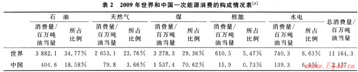 與世界相比,中國(guó)一次能源消費(fèi)結(jié)構(gòu)更不合理(表2),單位能耗的C02排放量較大。中國(guó)化石能源占總量的92.8%,而世界為87.89%;中國(guó)化石能源的主體是煤炭,占70.62%,而世界為29.36%?;茉粗蠧02排放量相對(duì)較低的天然氣,在中國(guó)能源構(gòu)成中僅占3.66%,而世界為23.6%;非化石能源中水電的比例中國(guó)與世界相近,但核能僅為0.73%,而世界為5.47%(表2)。由此可見(jiàn),中國(guó)降低C02排放、改善能源結(jié)構(gòu)的任務(wù)更加艱巨。