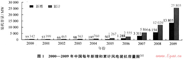 要完成上述指標(biāo)的任務(wù)十分艱巨。一次能源總需求量仍在高速增長(zhǎng),預(yù)計(jì)完成工業(yè)化在2030年左右,這段時(shí)間內(nèi)化石能源總產(chǎn)量不僅不可能下降,反而仍將繼續(xù)上升??稍偕茉春秃四茉?009年占總能源消費(fèi)的7.13%,要達(dá)到2020年的目標(biāo),需要提高7.87%。目前來(lái)看核電最為現(xiàn)實(shí),而太陽(yáng)能和風(fēng)能的間歇性、不容易控制和難以儲(chǔ)存等問(wèn)題在技術(shù)上尚未得到圓滿解決,成本也較高。如風(fēng)能近幾年發(fā)展十分迅速,2009年裝機(jī)總?cè)萘恳堰_(dá)25805MW[2](圖1),但發(fā)電量卻僅為裝機(jī)容量的12%(269×108kWh)。太陽(yáng)能熱發(fā)電比燃煤發(fā)電的用水量多68%。僅僅依靠核能和可再生能源實(shí)現(xiàn)一次能源總量增長(zhǎng)和C02減排,也存在相當(dāng)大的困難。