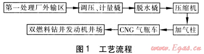 結(jié)合蘇里格氣田現(xiàn)狀,氣源來自蘇里格氣田第一天然氣處理廠,原料氣壓力為4.5~5.2MPa,溫度為0~20℃,經(jīng)調(diào)壓、計(jì)量、深度脫水后壓縮至20MPa,用CNG氣瓶車運(yùn)輸至井場,在井場調(diào)壓后供雙燃料機(jī)組使用。根據(jù)工藝要求,需要的設(shè)備主要有調(diào)壓計(jì)量裝置、脫水裝置、壓縮機(jī)、加氣柱、CNG氣瓶車、雙燃料鉆井發(fā)動(dòng)機(jī)機(jī)組前調(diào)壓計(jì)量裝置。工藝流程見圖1。
