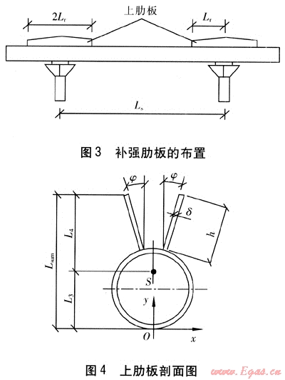 該方法通過增大管道截面系數(shù),使滑動支架跨距增加30%~60%[4],而多消耗的金屬不會超過管子重量的10%。當滑動支架間距較長時,可以在滑動支架處管道上方加焊肋板,肋板可用扁鋼或鋼板制成,補強肋板的布置見圖3。圖中,Ls為兩個滑動支架之間的距離,單位為m;Lr為滑動支架支點距肋板最遠端的距離,單位為m,取Lr=0.1Ls。上肋板剖面圖見圖4,圖中,φ為肋板與管子截面中心垂直線的夾角,單位為(°);δ為肋板厚度,單位為m;h為肋板高度,單位為m;點S為管道補強后的重心,點O為坐標原點;L3為點S、O間距離,單位為m;L4為點S距肋板上端的垂直距離,單位為m;Lsum為L3、L4之和,單位為m。圖4中兩側(cè)肋板軸線交于點S。