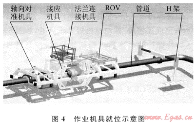 深海管道的連接,由于受到水深的制約,不可能采取潛水員作業(yè)形式,也不便采取水下密封艙作業(yè)形式,它采用一種無(wú)潛水員的自動(dòng)回接方法,通過(guò)水下機(jī)器人ROV控制法蘭連接機(jī)具完成管道的法蘭連接。該自動(dòng)法蘭連接機(jī)具的前提條件有:ROV控制整個(gè)過(guò)程,可以監(jiān)測(cè)法蘭孔的對(duì)正精度、提供液壓油源等外部動(dòng)作;兩個(gè)管道已經(jīng)由其他作業(yè)機(jī)具拖拽靠近,且保證兩個(gè)管道的法蘭貼近距離和管道同軸度在規(guī)定的范圍內(nèi)。圖4為作業(yè)機(jī)具就位圖,包括連接機(jī)具和輔助機(jī)具。輔助機(jī)具有軸向?qū)?zhǔn)機(jī)具、接應(yīng)機(jī)具、ROV和H架等。在法蘭連接作業(yè)之前,H架將管道提升離海底面一定高度,軸向?qū)?zhǔn)機(jī)具和接應(yīng)機(jī)具配合作業(yè)實(shí)現(xiàn)管道的初對(duì)準(zhǔn),這樣輔助機(jī)具可以將兩管道對(duì)齊到一定精度,再由法蘭連接機(jī)具作業(yè),最終實(shí)現(xiàn)管道法蘭的連接。